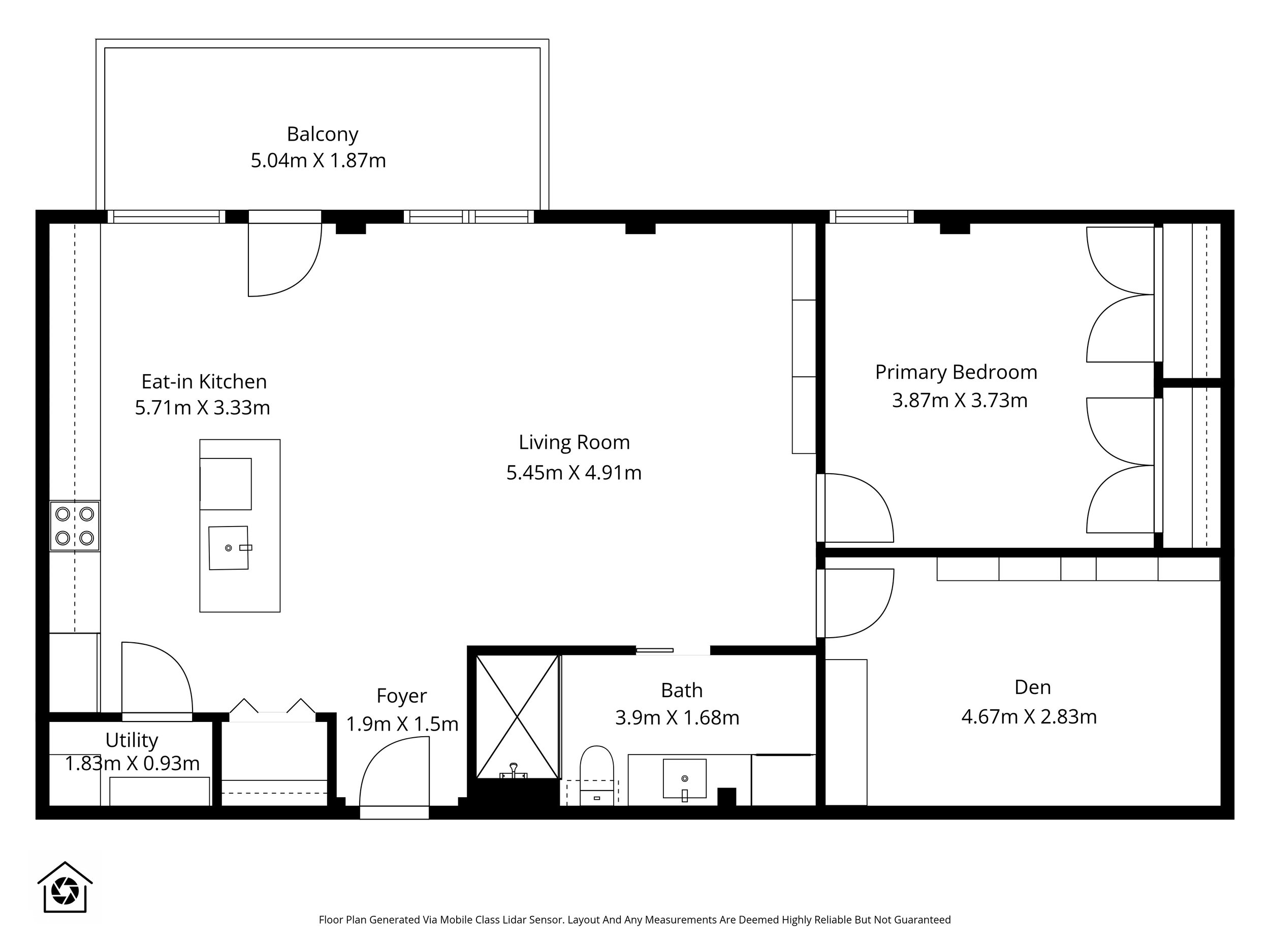 The bedroom area is set behind modern frosted glass doors, adding privacy while maintaining a contemporary aesthetic. The primary bedroom is generously sized with ample closet space, while the den functions well as a home office, guest room, or flex space. Custom bookshelf and closet built-ins in the den are included, along with all appliances and light fixtures. In-unit laundry is conveniently located within the bathroom, and additional pantry-style storage further enhances everyday livability.