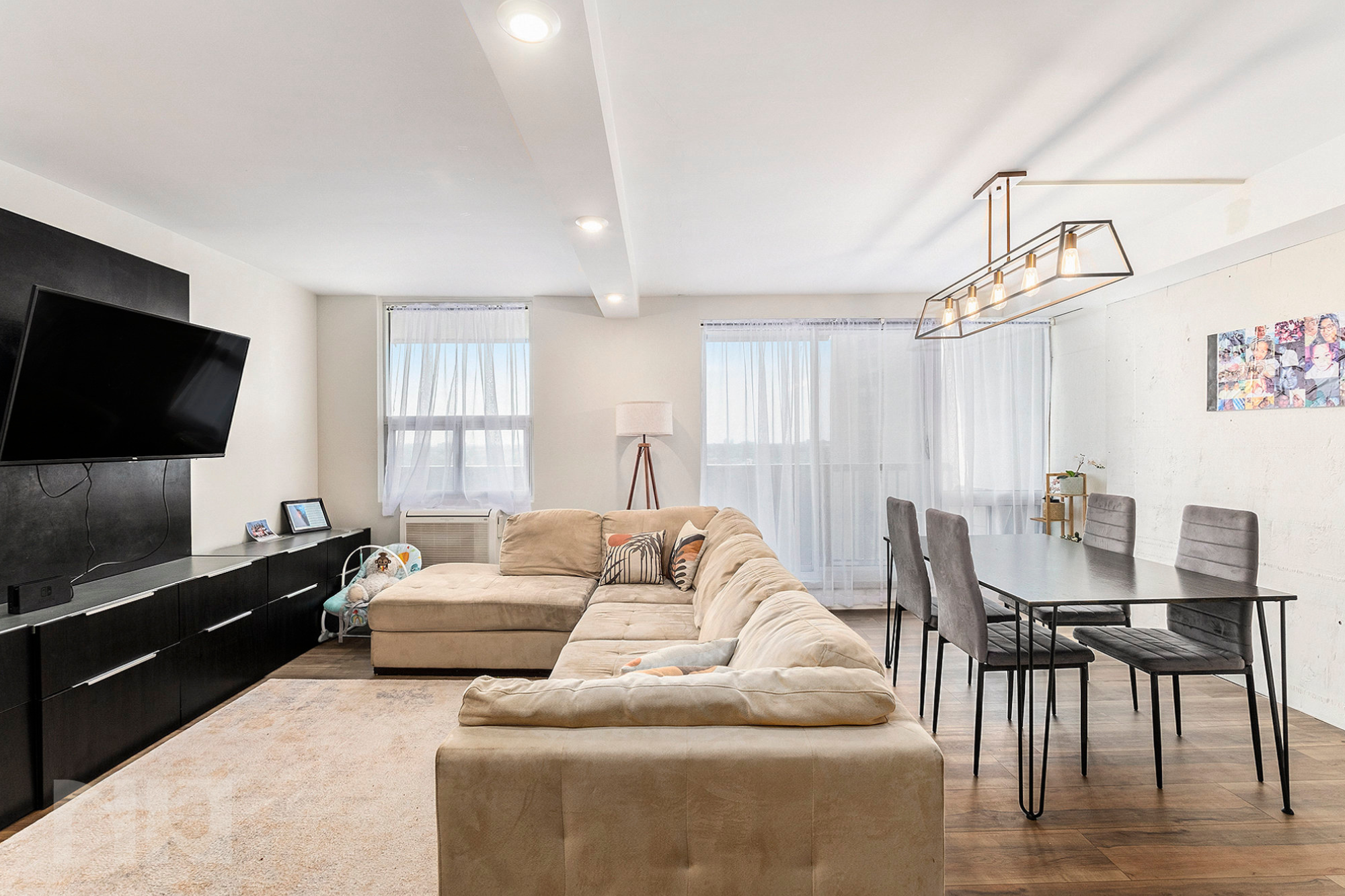 As the only ground-floor unit in the building, Unit 101 offers unmatched convenience with direct access from the main lobby and a parking space (spot #17) located just steps away. Inside, the space feels bright and inviting, thanks to large windows and a modern open layout. The living area is expansive enough to accommodate both a comfortable seating area and a dining space, making it perfect for entertaining or quiet evenings at home.